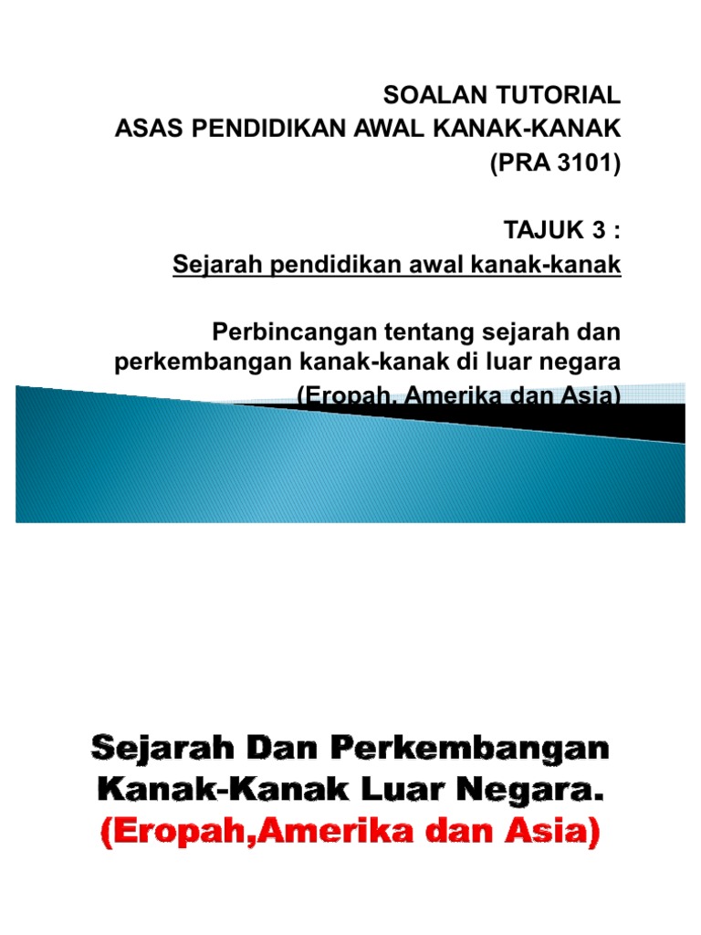Pendidikan awal kanak-kanak diberi seawal usia lahir hingga berumur 8 tahun. 21082017 Definisi Awal Kanak-Kanak. 04012019 Kanak-kanak ibarat kain putih yang perlu dicorakkan oleh ibu bapa supaya menjadi pelapis generasi negara.