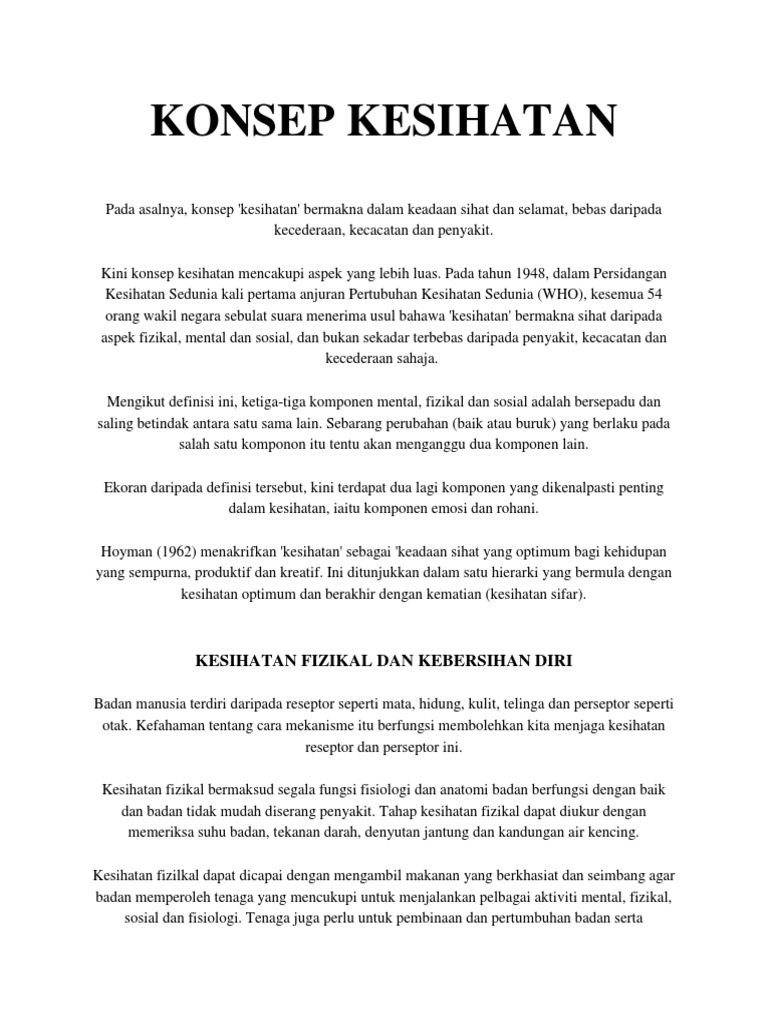 Keadaan alam sekeliling yang tidak menjejaskan hidupan iv. Menurut Pertubuahan Kesihatan Sedunia WHO kesihatan adalah suatu keadaan yang sempurna dari segi fizikal mental sosial dan tidak semata-mata bebas daripada penyakit dan cacat cedera sahaja.