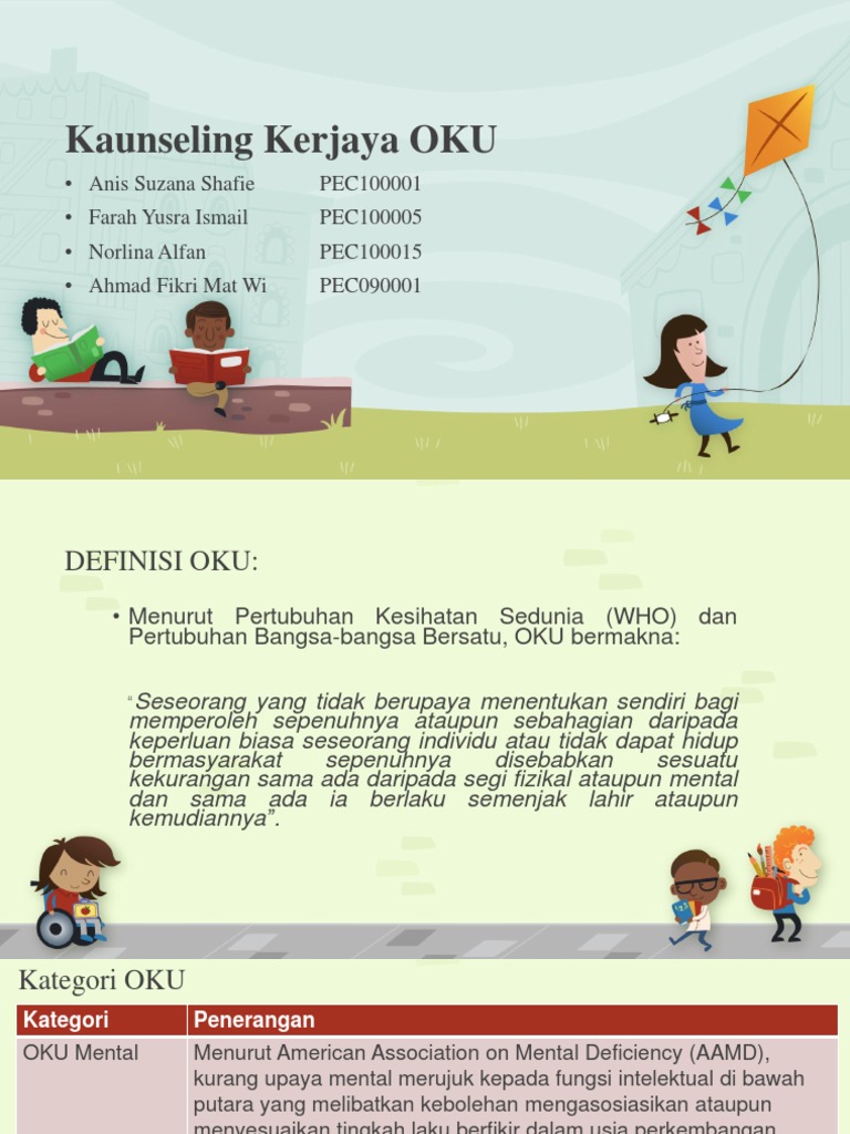 JENIS PENDAFTARAN PENDAFTARAN BAHARU. Orang Kurang Upaya OKU ditakrifkan sebagai mereka yang mempunyai kekurangan jangka panjang fizikal mental intelektual atau deria yang apabila. 978-967-2072-06-5 PENYEDIAAN FASILITI ORANG KURANG UPAYA OKU DI INSTITUSI PENGAJIAN TINGGI DI LEMBAH KLANG.